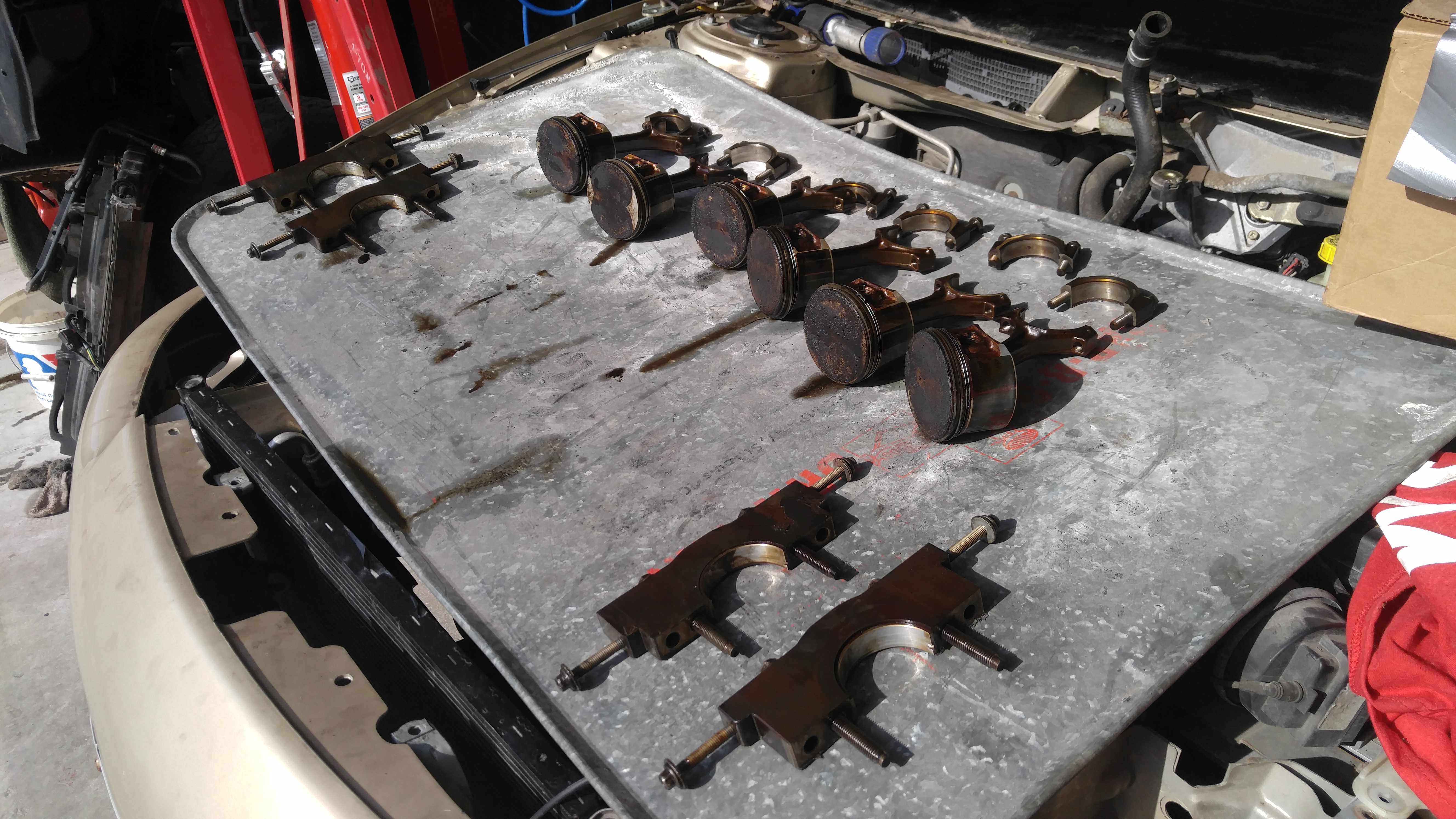 Pistons and bearing caps ready to be cleaned.